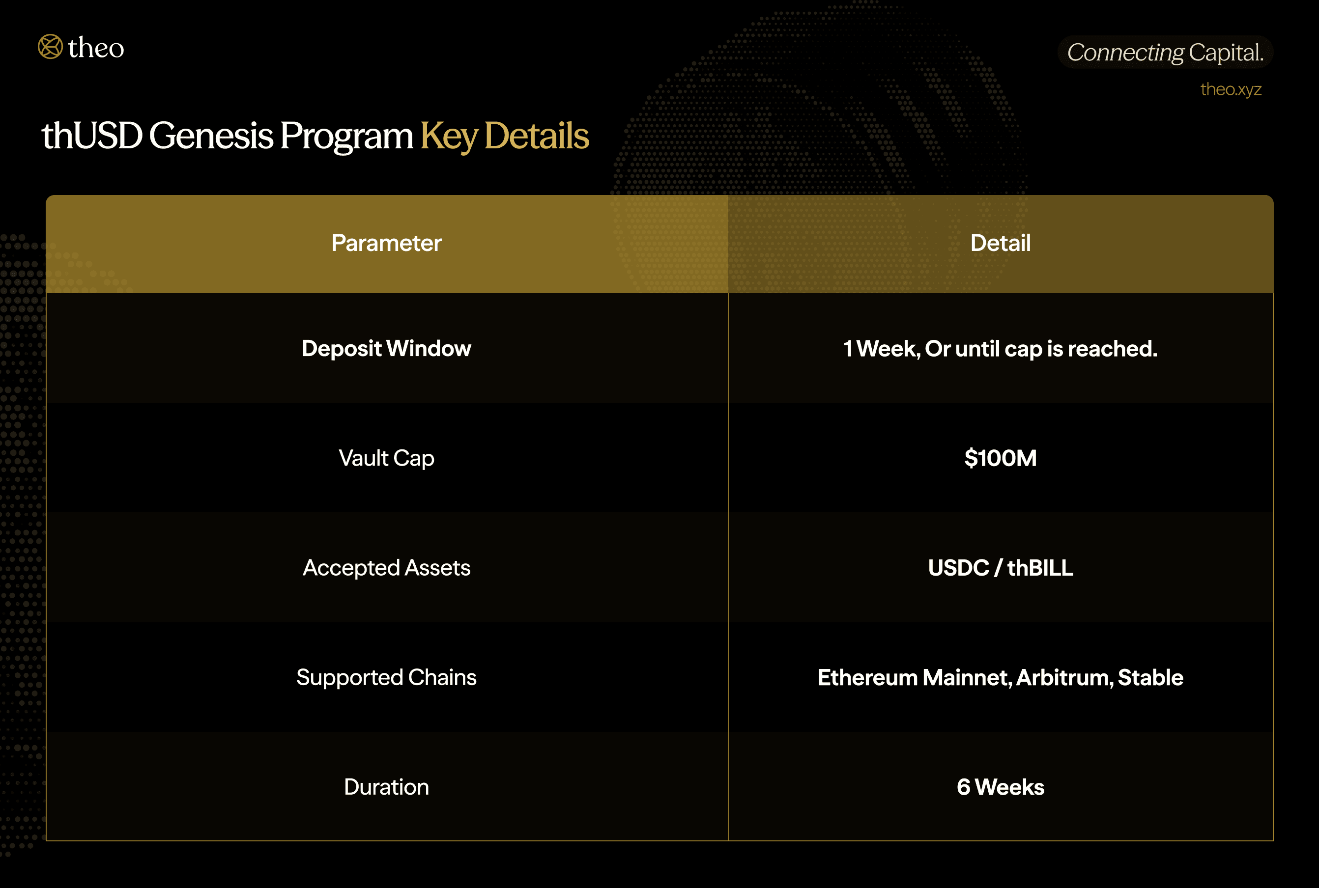 The thUSD genesis program is an early access window for participants to commit capital ahead of thUSD's full launch. Deposits are accepted in USDC and thBILL on Ethereum, Arbitrum, and Stable. The Genesis Vault is powered by Concrete.